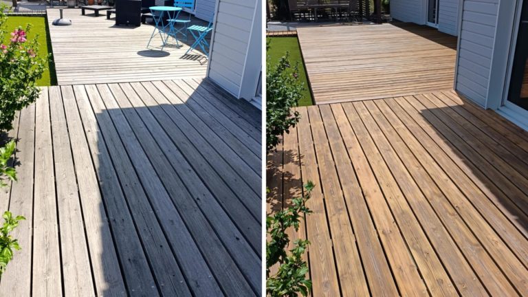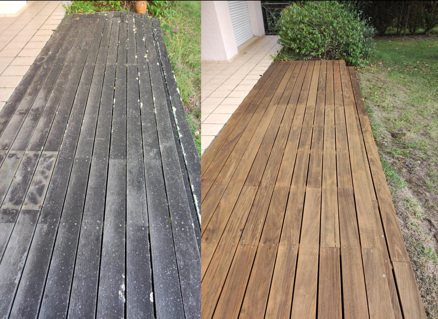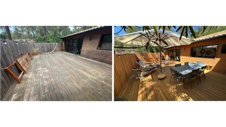 - La rénovation des espaces extérieurs : redonner une seconde jeunesse à une terrasse en bois vieilli ou une dalle en pierre ternie.